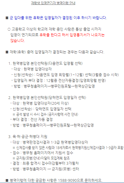 만20세대학생입니다 대학교재학생은당해년도입영신청이가능합니까?아니면따로재학생입영원신청을해야합니까?